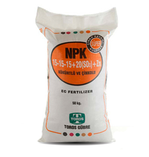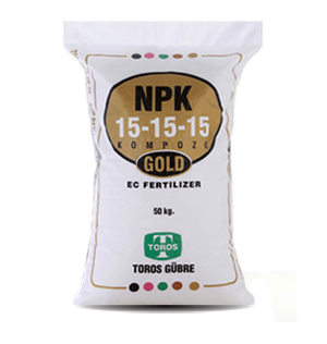 %15 Azot (N) %15 Fosfor (P2O5) %15 Potasyum (K2O) %15 Kükürt (S) Özellikle üç ana besin maddesince (azot, fosfor ve potasyum) fakir olan topraklarda dengeli gübreleme yapmak için tercih edilmesi gereken bir üründür. Bünyesinde azot, fosfor ve potasyuma ilave olarak önemli bir bitki besini olan kükürt (S) bulunur. Gübre içindeki kükürt, bitkiler tarafından alınabilir form olan sülfat (SO4) halinde ve minimum %15 oranında ihtiva edilir. NPK 15-15-15 Kompoze Gold, içeriğindeki kükürtten dolayı “Dört 15 Kompoze” (15.15.15.15) olarak da adlandırılabilir.